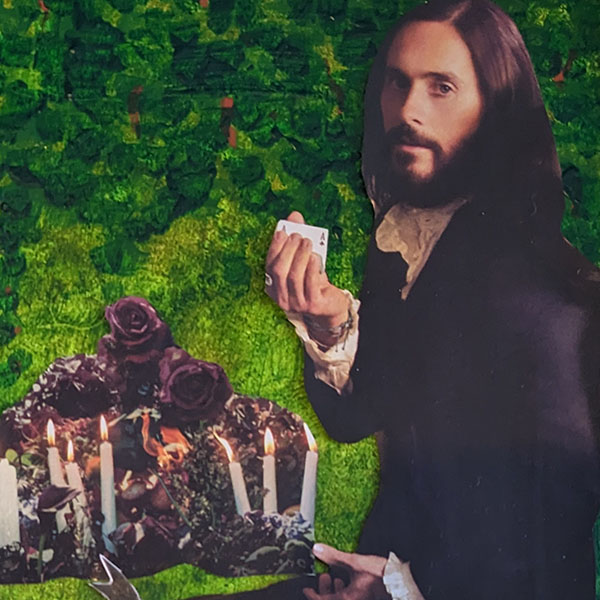 First, the absolute delightful luck of finding the Jared Leto photo. He generally plays men that are more mysterious and has that air about his actual person, as well. It turned out, he is also flipping cards in this image even though that’s not readily apparent without looking closely. Regardless, it is perfect because Bluebeard is thought to be a failed or reduced magician. I was also very happy with the images of the woman in this specific Anthropolgie catalog. She has a wide-eyed quality about her, making her seem innocent. There are also multiple photos of her in different outfits which will help keep the series united since I can use the same woman.