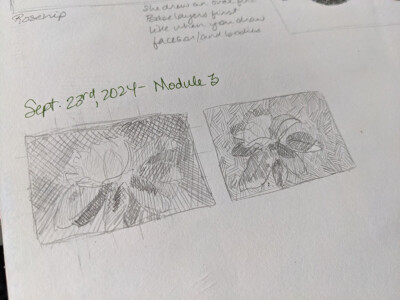 I also liked that she had warm up exercises using different sized pens and different spacing for the markings so that we could see the difference and also warm up our hands. There were a few practice exercises, small nature images to further practice her style of drawing. And for the larger drawing, we did smaller sketches to get a feel for the layout and the shading.