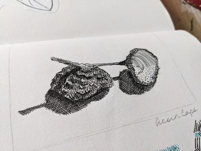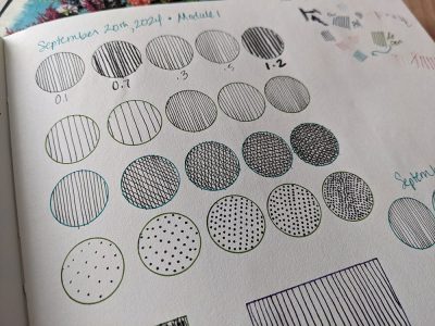 I also liked that she had warm up exercises using different sized pens and different spacing for the markings so that we could see the difference and also warm up our hands. There were a few practice exercises, small nature images to further practice her style of drawing. And for the larger drawing, we did smaller sketches to get a feel for the layout and the shading.
